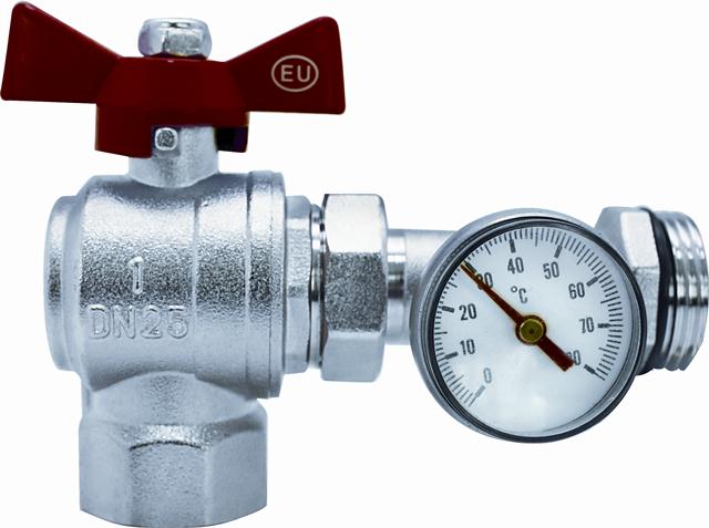 Кран шаровой латунный коллекторный с термометром (диапазон 0-80 °С, D=40 мм), угловой