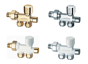 Узел нижнего подключения с терморегулирующим и запорным вентилями для однотрубных систем.