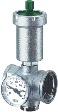 Хромированный переходник, дополненный клапаном для выпуска воздуха, термометром и заглушкой.