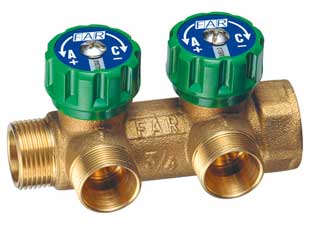 Коллектор регулирующий НР-ВР, проходной с 2 отводами (МР)из латуни стойкой к дезоцинковыванию. Снабжён регулирующими вентилями с двусторонним диском «СИНИЙ-КРАСНЫЙ» и диском с обозначением для сантехнических установок или отопительных систем.