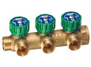 Коллектор регулирующий НР-ВР, проходной с 3 отводами (МР)из латуни стойкой к дезоцинковыванию. Снабжён регулирующими вентилями с двусторонним диском «СИНИЙ-КРАСНЫЙ» и диском с обозначением для сантехнических установок или отопительных систем.