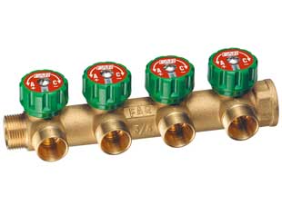 Коллектор регулирующий НР-ВР, проходной с 4 отводами (МР)из латуни стойкой к дезоцинковыванию. Снабжён регулирующими вентилями с двусторонним диском «СИНИЙ-КРАСНЫЙ» и диском с обозначением для сантехнических установок или отопительных систем.