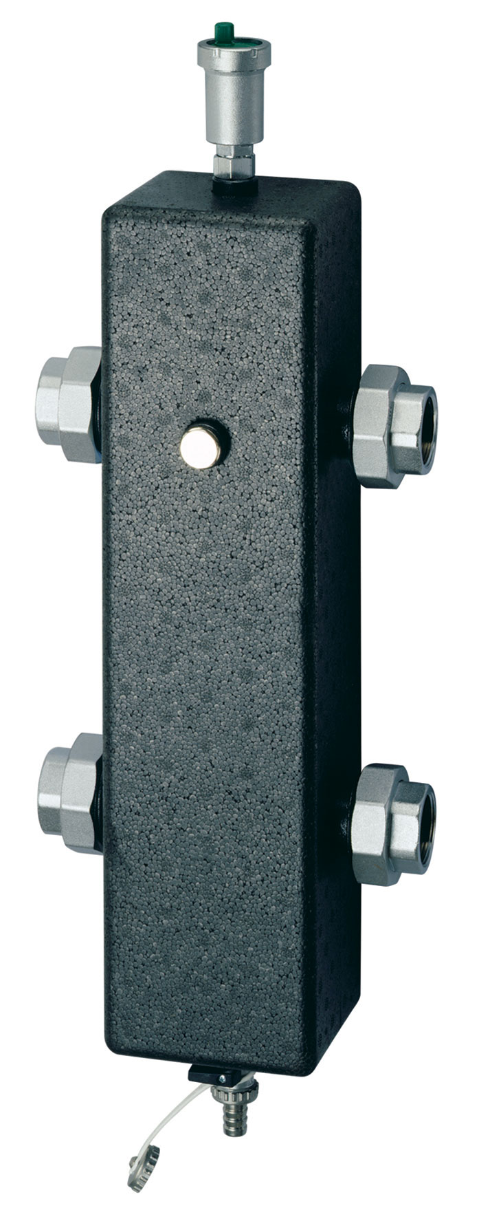 Гидравлический разделитель, укомлектованный теплоизоляцией, автоматическим воздухоотводчиком с обратным клапаном и сливным краном.