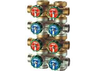 Коллектор параллельный, регулирующий, проходной, сборный, из латуни стойкой к дезоцинковыванию.