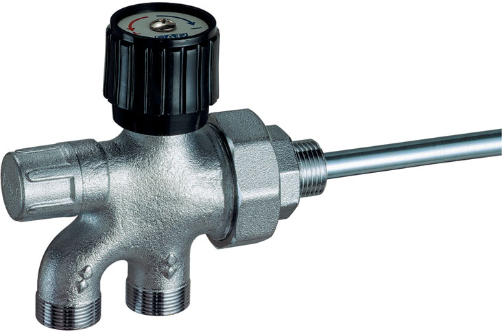 Узел нижнего подключения для однотрубных систем с регулирующим и запорным вентилями.