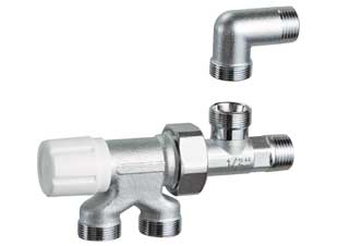 Узел нижнего подключения для однотрубных систем, регулирующий, с горизонтальной ручкой, реверсивной насадкой и верхним угольником.