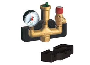 Группа безопасности котла с теплоизоляцией, манометром на 4 бар, автоматическим воздухоотводчиком и предохранительным клапаном на 3 бар.