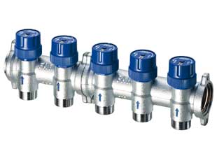 Сборный хромированный фланцевый модульный коллектор со встроенными вертикальными регулирующими вентилями, снабжен винтами и прокладкой для подсоединения. возможна автоматическая регулировка (устанавливается путем разборки вентилей и присоединения элетротермической головки).